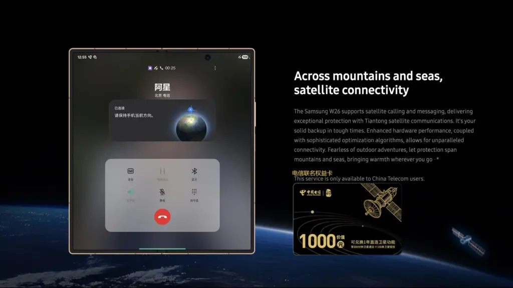 Das herausragendste Merkmal des Samsung W26 ist zweifellos die direkte Satellitenkommunikation. Über das chinesische Tiantong-Netzwerk kann das Gerät Notrufe und Textnachrichten via Satellit senden – selbst dann, wenn keinerlei Mobilfunkempfang besteht.