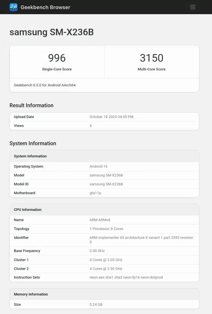 Im Geekbench-Ergebnis erreicht das Galaxy Tab A11+ mit der Modellnummer SM-X236B einen Single-Core-Wert von 996 Punkten und 3150 Punkte im Multi-Core-Test. Zum Vergleich: Das Galaxy Tab A9+, das auf den Snapdragon 695 setzte, kam auf etwa 950 Punkte im Single-Core und 2000 Punkte im Multi-Core-Bereich. Damit ergibt sich ein Leistungszuwachs von rund 50 Prozent bei Multi-Core-Aufgaben – ein beachtlicher Fortschritt in dieser Preiskategorie.
