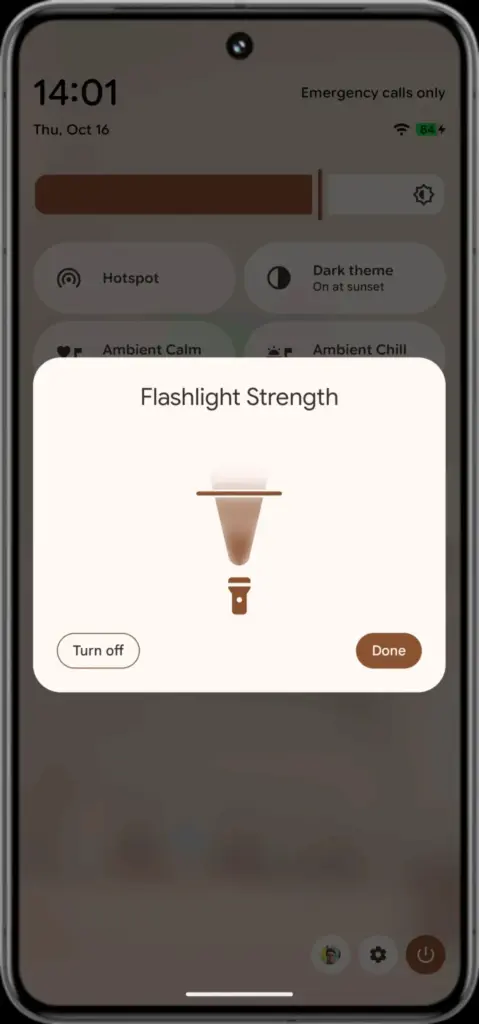 Nun arbeitet Google endlich an einer nativen Lösung. In der jüngsten Android Canary-Version 2510 wurde ein fast fertiges Konzept entdeckt, das den Nutzern künftig erlaubt, die Leuchtkraft der LED-Taschenlampe manuell zu regulieren.