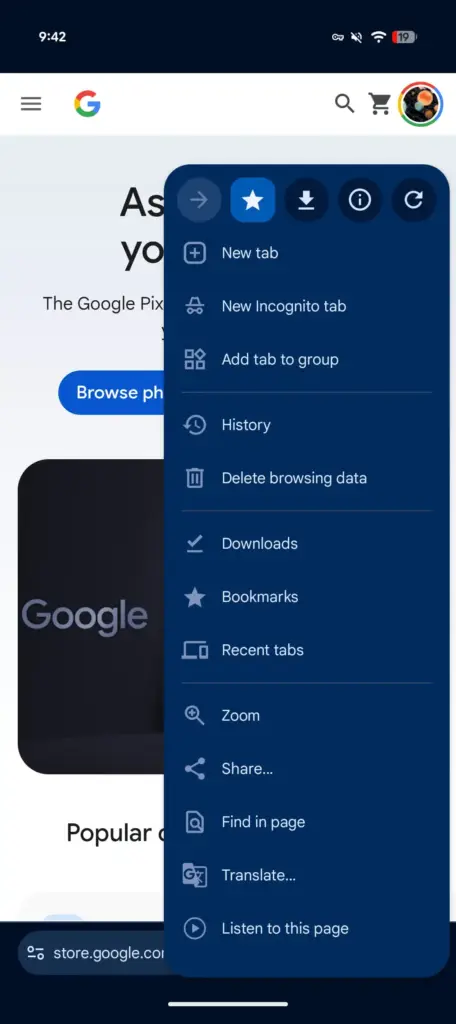 Wer jetzt das Drei-Punkte-Menü öffnet, bemerkt sofort die neue Gestaltung. Die Schaltflächen für Vorwärts, Lesezeichen, Downloads, Seiteninformationen und Aktualisieren sitzen nun in runde oder abgerundete Container, die für mehr Übersicht und ein harmonisches Layout sorgen.