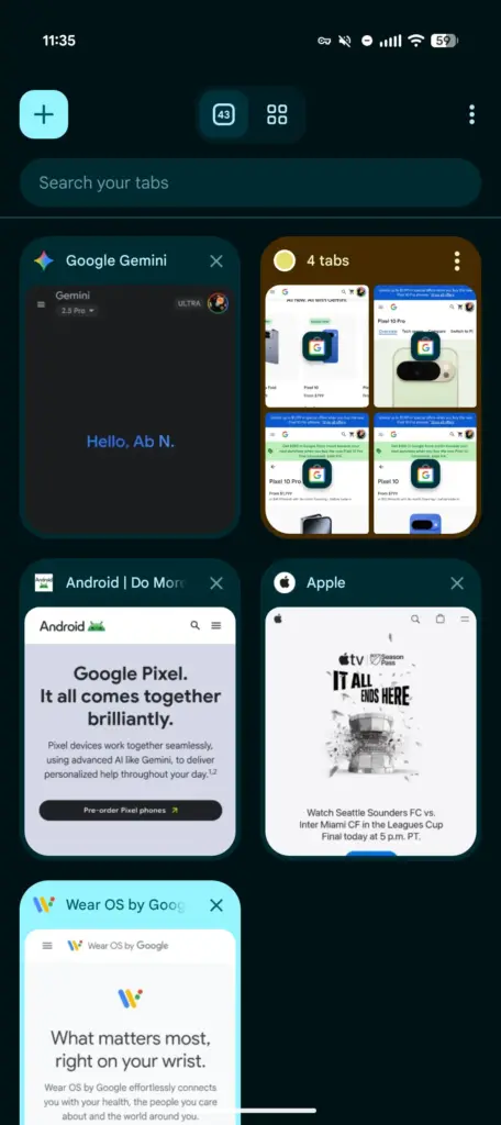 Ebenso erhalten die Tab-, Inkognito- und Gruppen-Schalter eigene visuelle Container, die das aktuelle Segment klar markieren. Besonders auffällig: Tab-Gruppen übernehmen die Akzentfarbe des Systems – so erkennt man sofort, welche Gruppe gerade aktiv ist. Diese Dynamik orientiert sich am Material-You-Prinzip, das auf Android seit Version 12 zum Markenzeichen geworden ist.