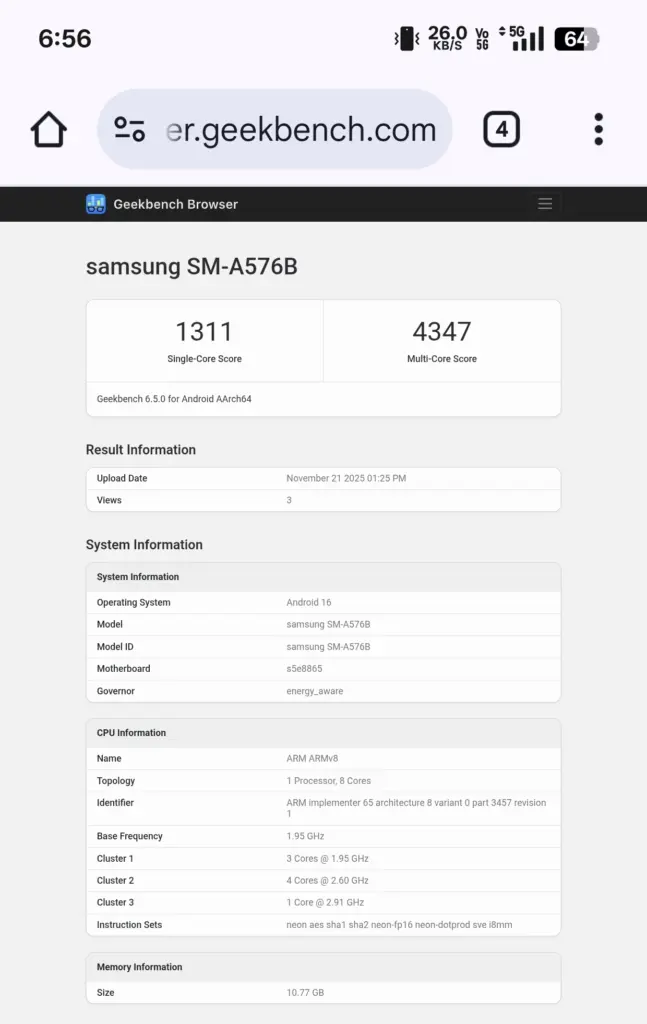 Ein internes Testgerät des Galaxy A57 5G ist kürzlich in der Geekbench-Datenbank aufgetaucht. Das Ergebnis liefert eine klare Richtung: