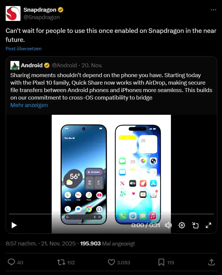 In einem Statement auf X reagierte Qualcomm auf Googles Einführung der neuen Quick Share Architektur. Der Konzern stellte klar, dass man derzeit daran arbeite, diese Funktionalität auch auf Geräten mit Snapdragon-Plattform zu ermöglichen.